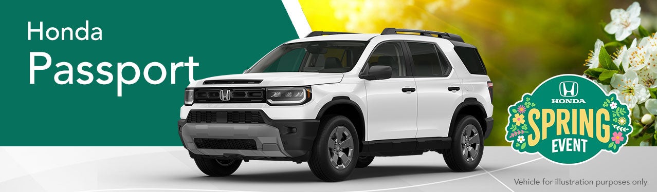 APR Available on approved credit through Honda Financial Services in select states only. 3.49% APR for up to 36 months on select new and unregistered 2026 Honda Passport models through 4/30/2026, for well-qualified buyers. Not all buyers will qualify. Higher financing rates apply for buyers with lower credit ratings. Actual down payment may vary. Dealer participation may affect actual payment. Dealer sets actual prices. See participating dealers for details.