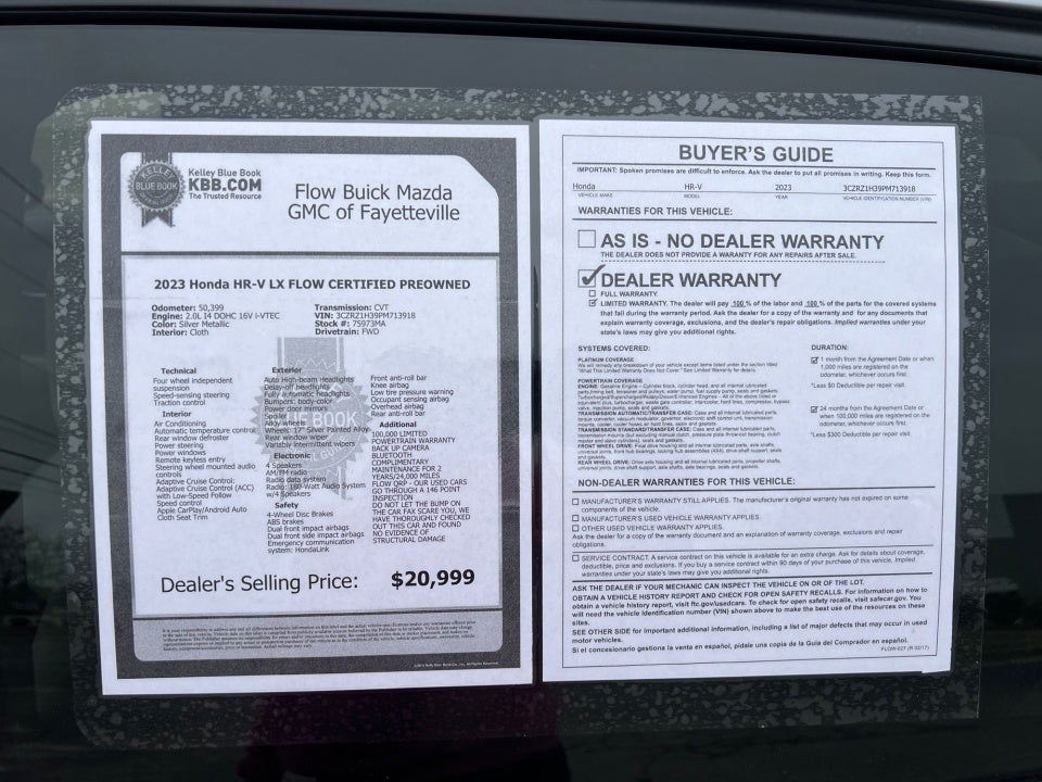 Flow Buick Mazda GMC of Fayetteville is pumped up to offer this outstanding-looking 2023 Honda HR-V Silver Metallic LX with the following features: FLOW CERTIFIED 2YR/100 000 MILE POWERTRAIN WARRANTY 3 day money back guarantee and a free maintenance package! ** 100 000 LIMITED POWERTRAIN WARRANTY BACK UP CAMERA Bluetooth® COMPLIMENTARY MAINTENANCE FOR 2 YEARS/24 000 MILES FLOW QRP - OUR USED CARS GO THROUGH A 146 POINT INSPECTION DO NOT LET THE BUMP ON THE CAR FAX SCARE YOU WE HAVE THOROUGHLY CHECKED OUT THIS CAR AND FOUND NO EVIDENCE OF STRUCTURAL DAMAGE HR-V LX FLOW CERTIFIED PREOWNED 4D Sport Utility 2.0L I4 DOHC 16V i-VTEC CVT FWD Silver Metallic Gray Cloth.
