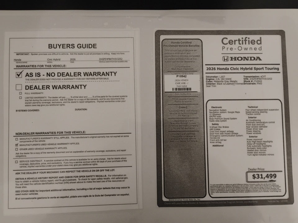 Flow Honda is honored to offer this wonderful-looking 2026 Honda Civic Hybrid Meteorite Gray Metallic Sport Touring with the following features: